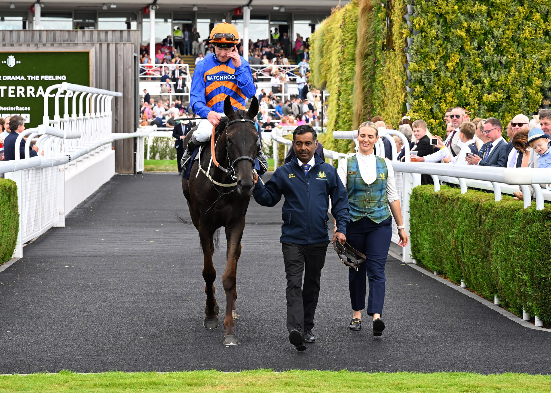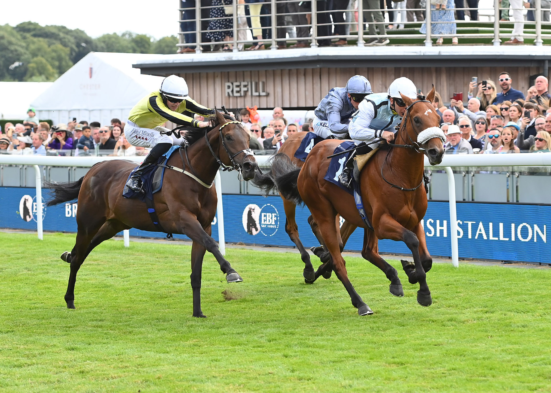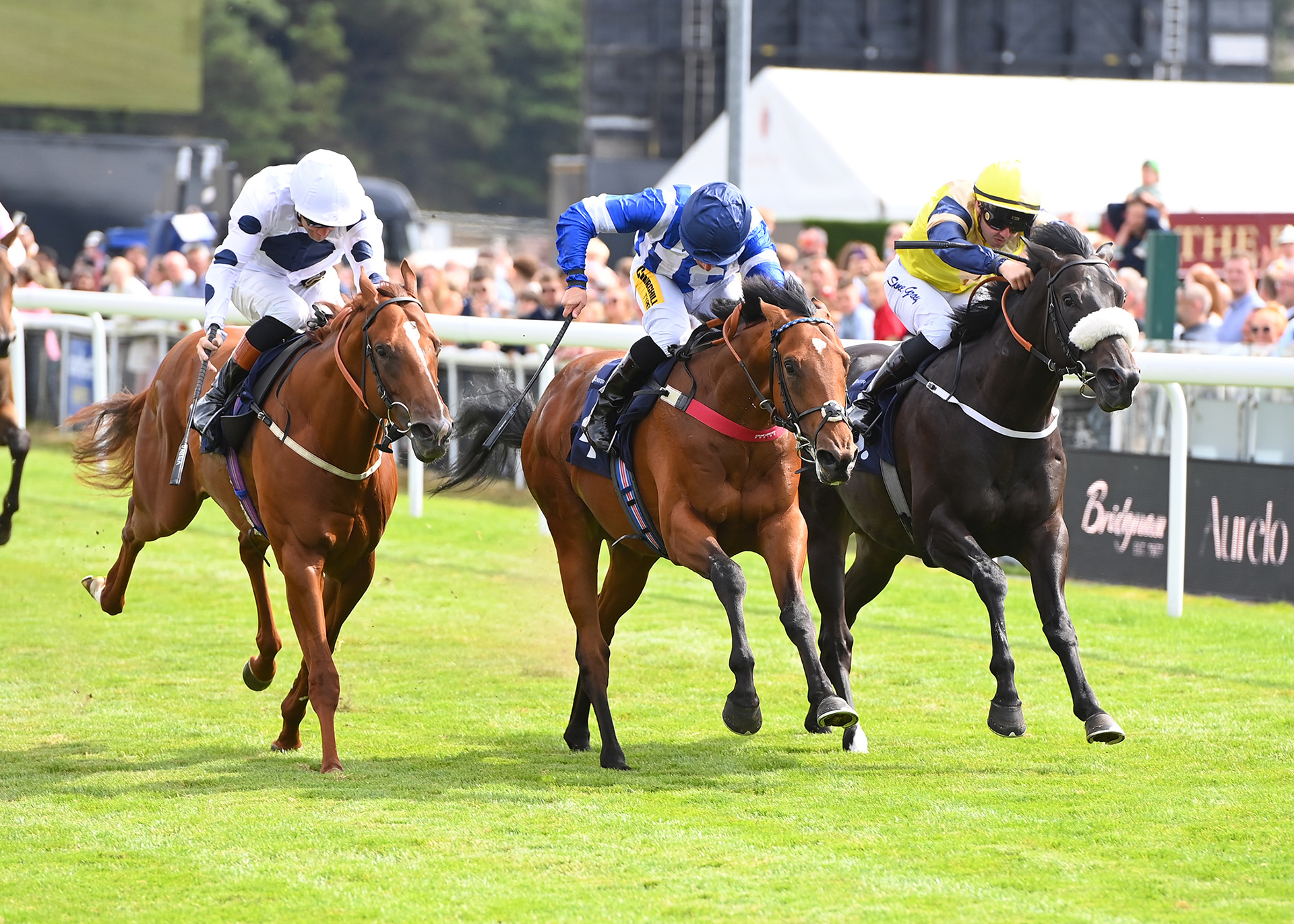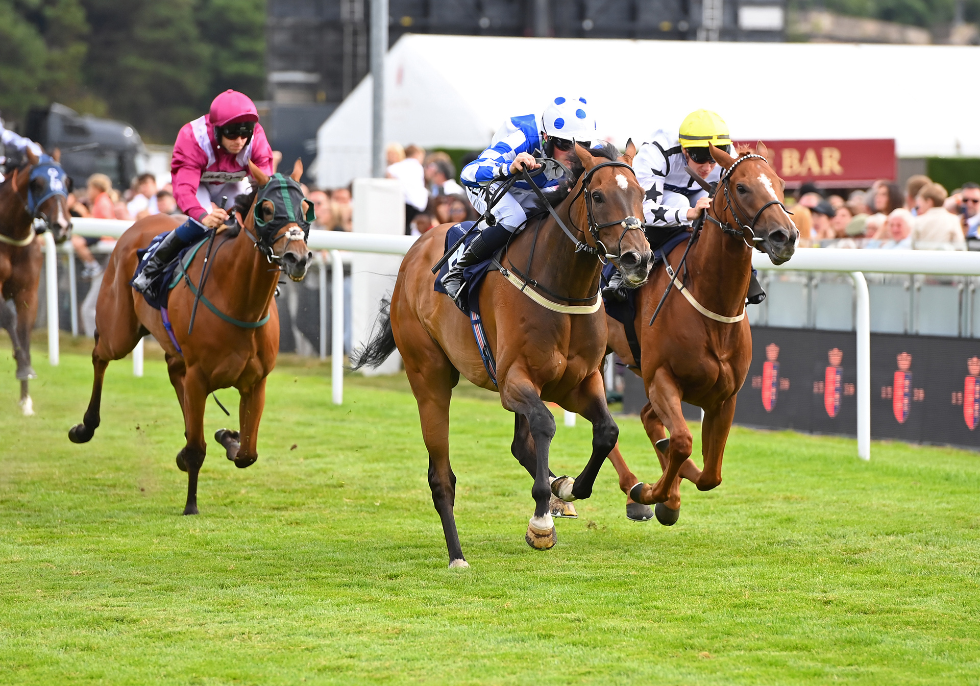 A winner here in June, Ghaiyya (9/2) repeated the feat in determined style when returning a narrow winner of the first race, scrambling home by ¾ of a length for Joe Fanning and Charlie Johnston. Always prominent to the outside of Mafting (16/5), Ghaiyya helped to set a good gallop out in front through the opening mile, racing a length clear of recent course runner-up Kokinelli (11/2) with half a mile to go. Swinging around the home bend still full of running, Ghaiyya was set alight by his rider at the two-furlong marker, and after managing to sneak a couple of lengths clear at the furlong pole, the leader ran on well to see out a tidy victory. Ever consistent, Johnston & Fanning also scored at Listed level in May with both Francophone and Madame Ambassador!