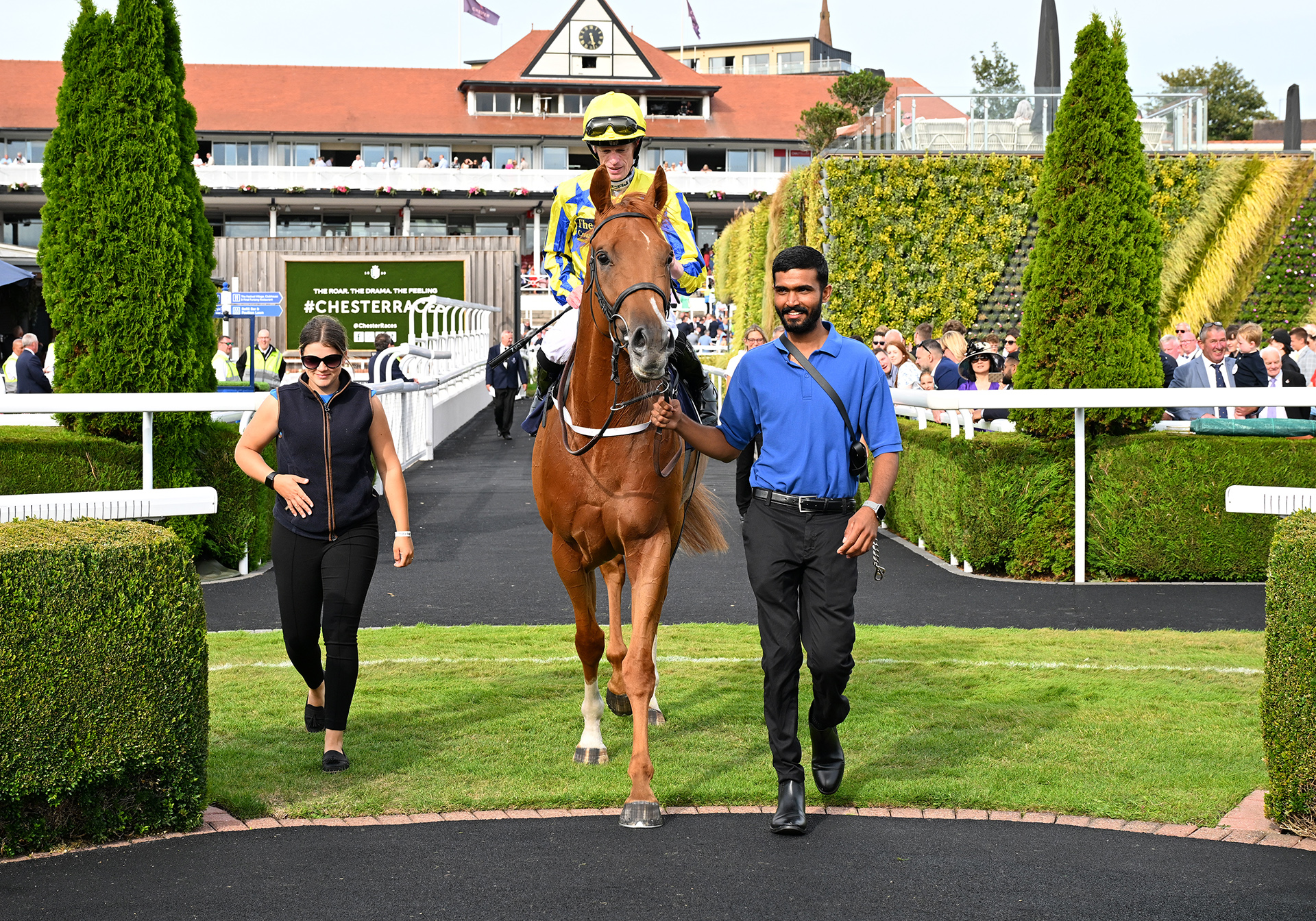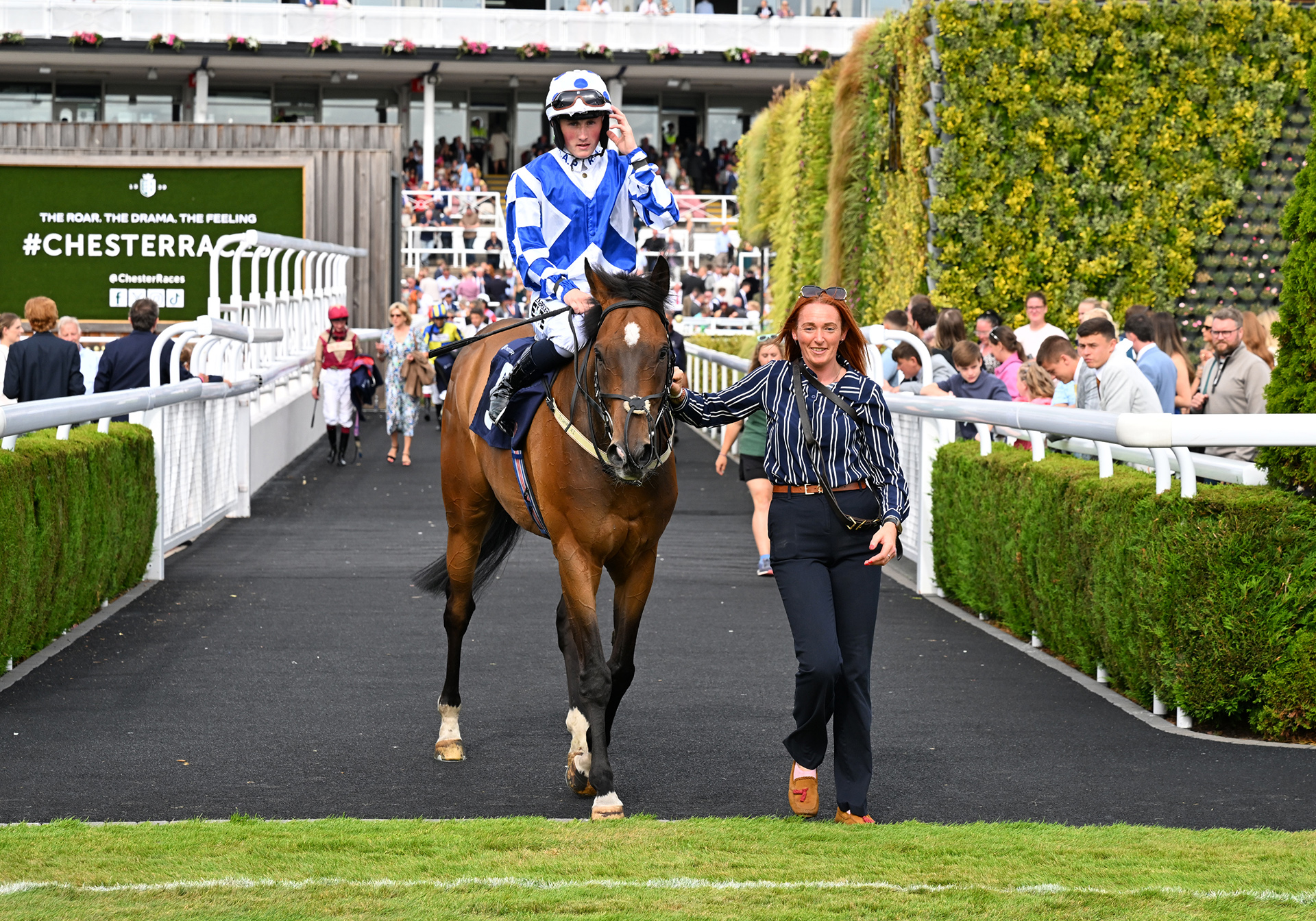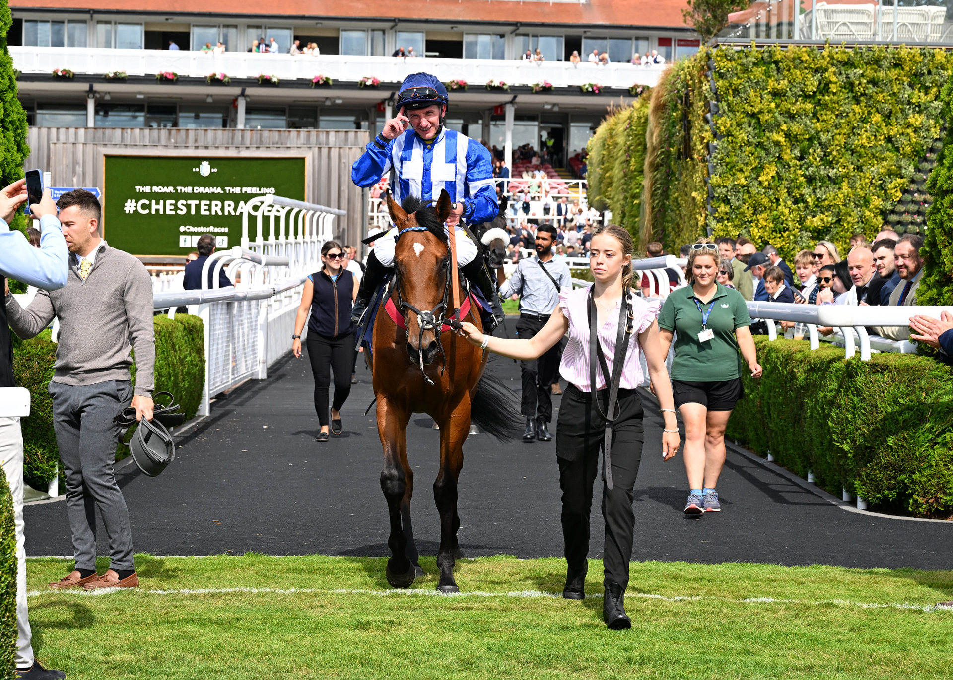 A legend in his own right, Roman Dragon (16/1) delivered a record-breaking seventh win on the Roodee when a brilliant winner of the Queensferry Stakes, holding on bravely by a nose to score for Jason Watson and Hugo Palmer. Strongly ridden out of the starting stalls, Roman Dragon quickly found himself in prime position at the first turn, leading the way by a length to The Strikin Viking (25/1) as Celandine (5/4F) hugged the rail in third place. Tanking along at the head of affairs, Roman Dragon soon nicked couple of lengths on his rivals coming towards the home turn, slipping the field with two furlongs to go as Celandine gave chase. Rousted along, Roman Dragon fought on bravely in the final furlong, and although joined on the line by a rallying Celandine, the Roodee hero just did enough to bag the all-time course record. Well and truly cementing himself in our history, Roman Dragon has certainly repaid the faith of local owner Nick Hughes!
